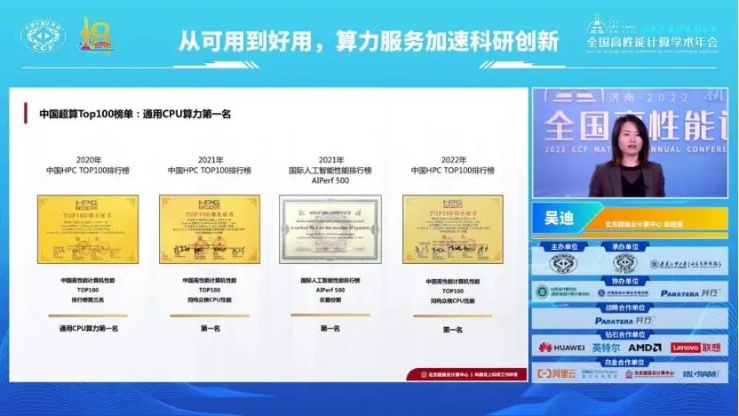 北京超算基于云化的算力服务模式受到广泛关注与认可,在最新的2022中国HPC TOP100排行榜中,北京超算再次蝉联HPC TOP100排行榜通用CPU算力性能(同构众核CPU性能)第一名。而在本次大会上,北京超算再获殊荣,荣获“算力服务创新奖”。